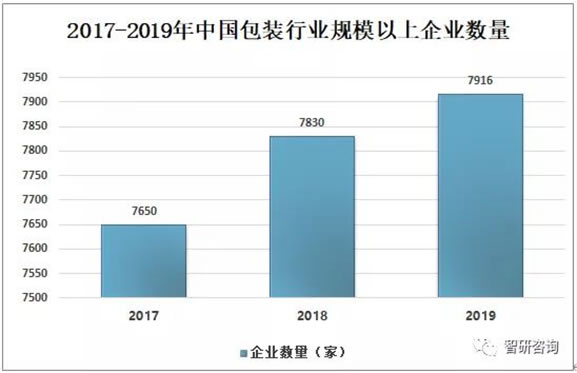 随着中国包装工业的快速发展,包装生产在促进国民经济建设、改善 人民群众物质文化生活中的地位作用的日益显现,包装产业作为一个独立的行业体系,其发展已被列入国民经济和社会发展规划。2019年中国包装行业规模以上企业数量7916家,比2018年中国包装行业企业数量增加86家。