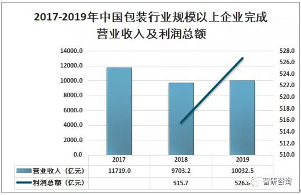 面对复杂多变的外部形势,包装行业总体保持了平稳运行。2019年包装行业规模以上企业营业收入为10032.5亿元,同比增长3.4%;中国包装行业规模以上利润总额为526.8亿元,同比增长2.2%。